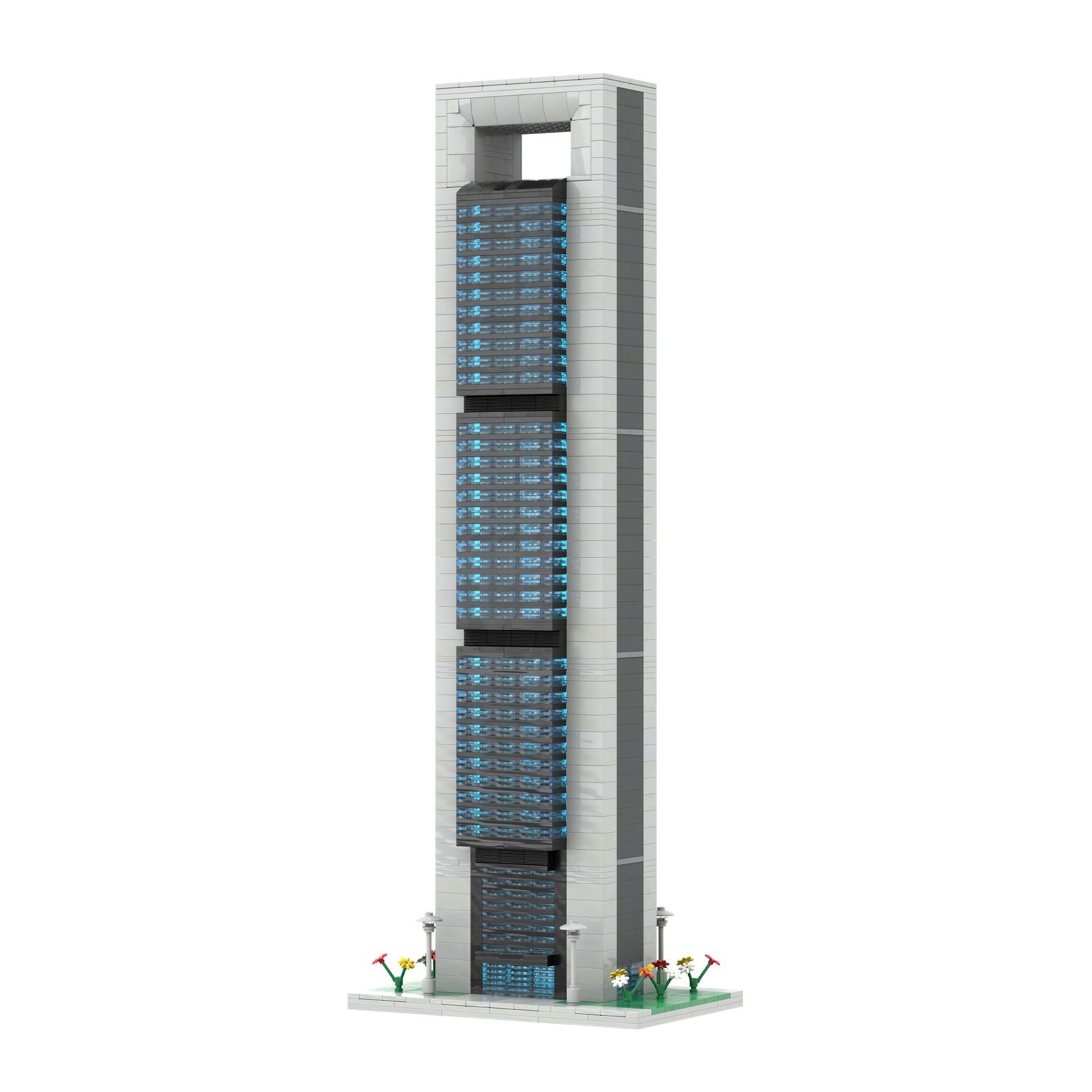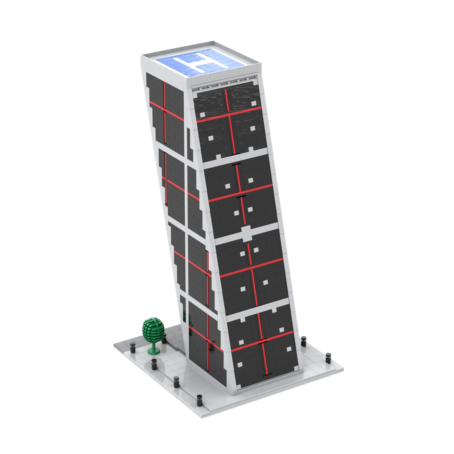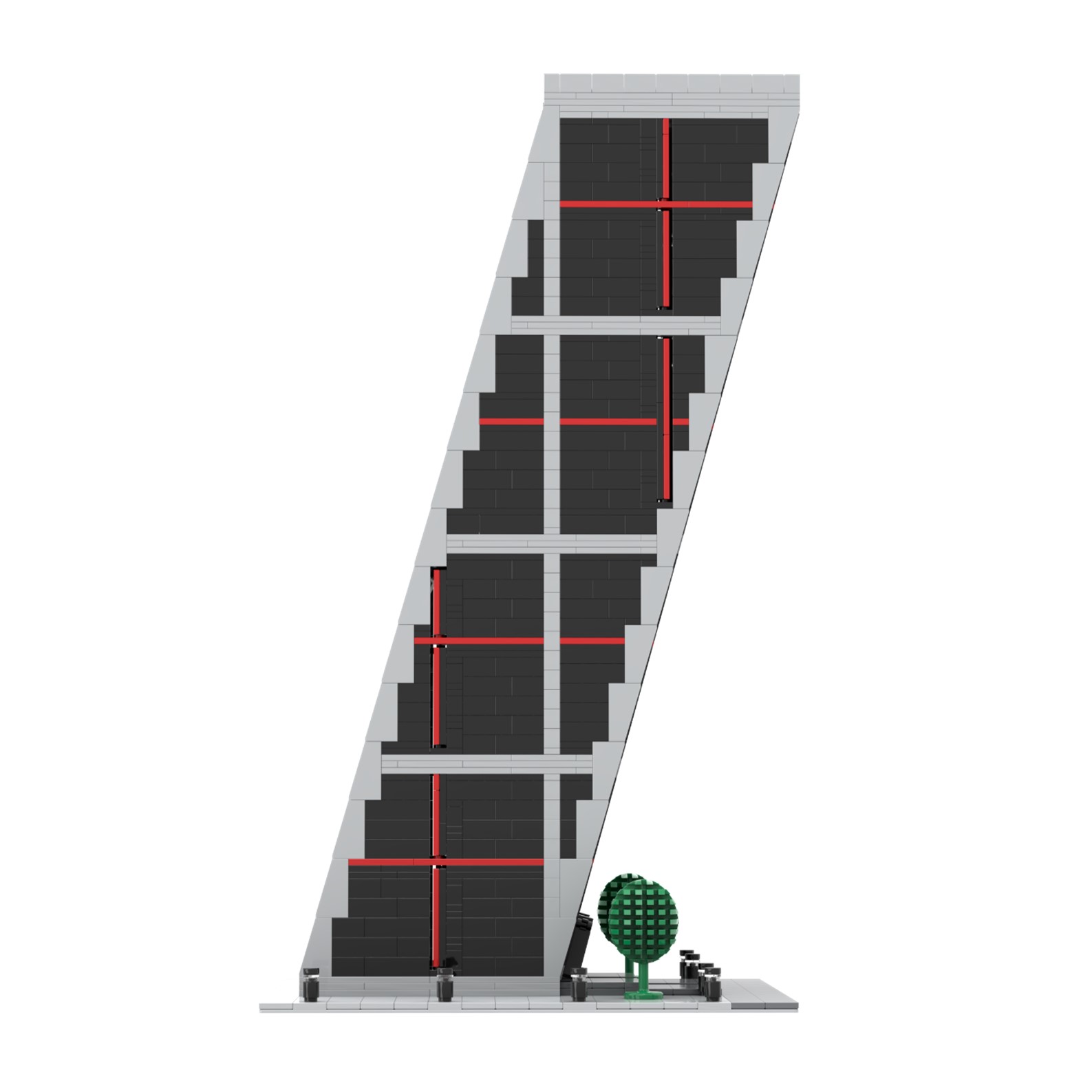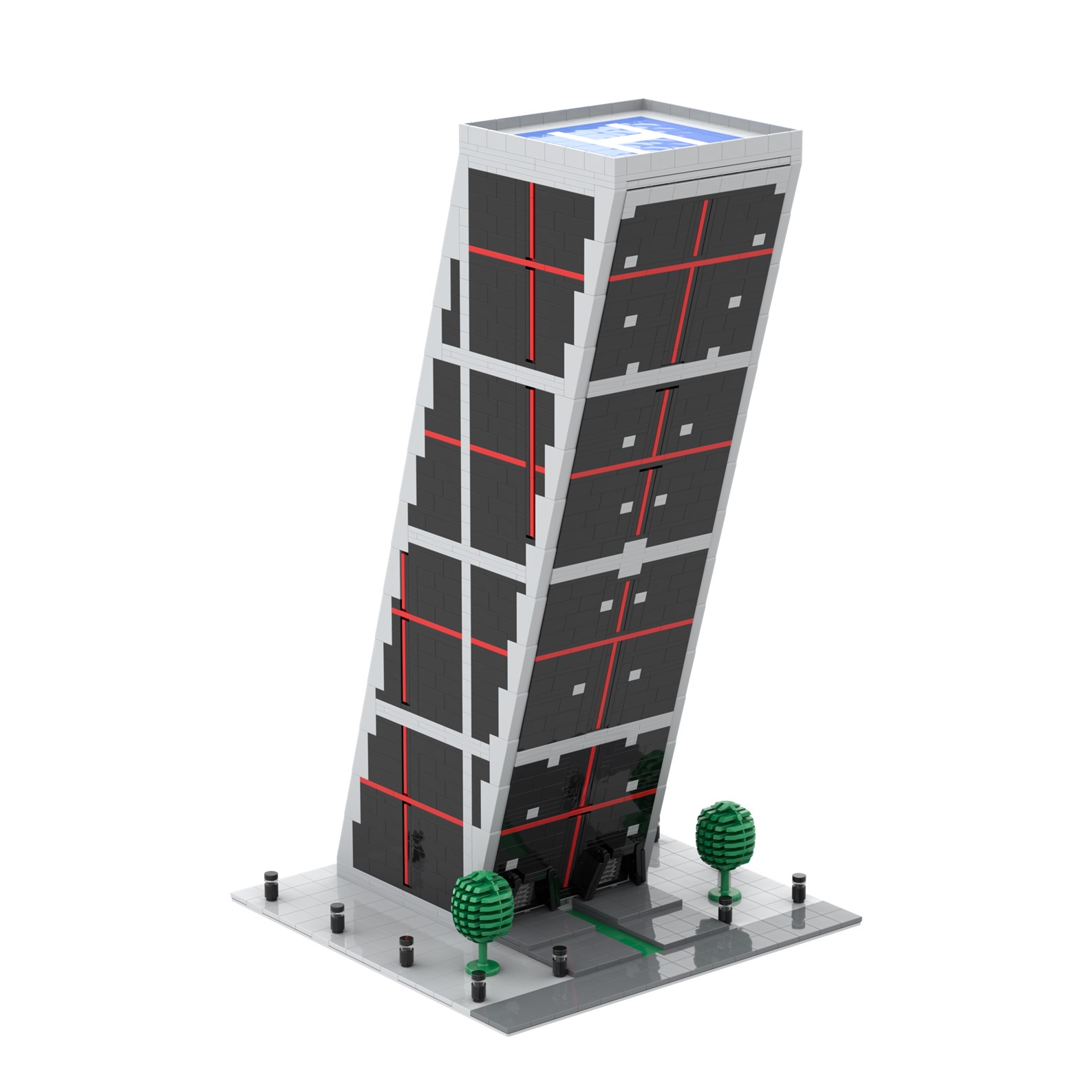 - La estructura de maqueta está diseñada con piezas de color gris y negras, con grandes ventanales de color azul claro.