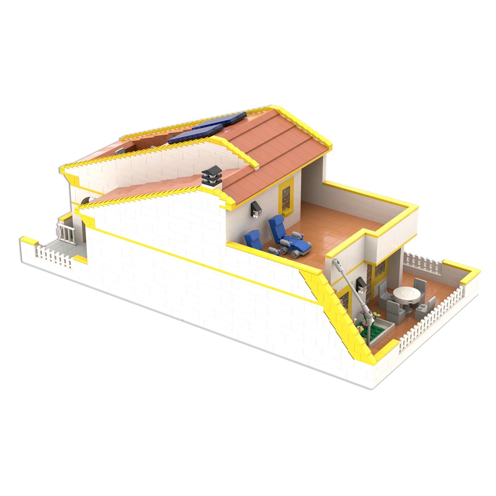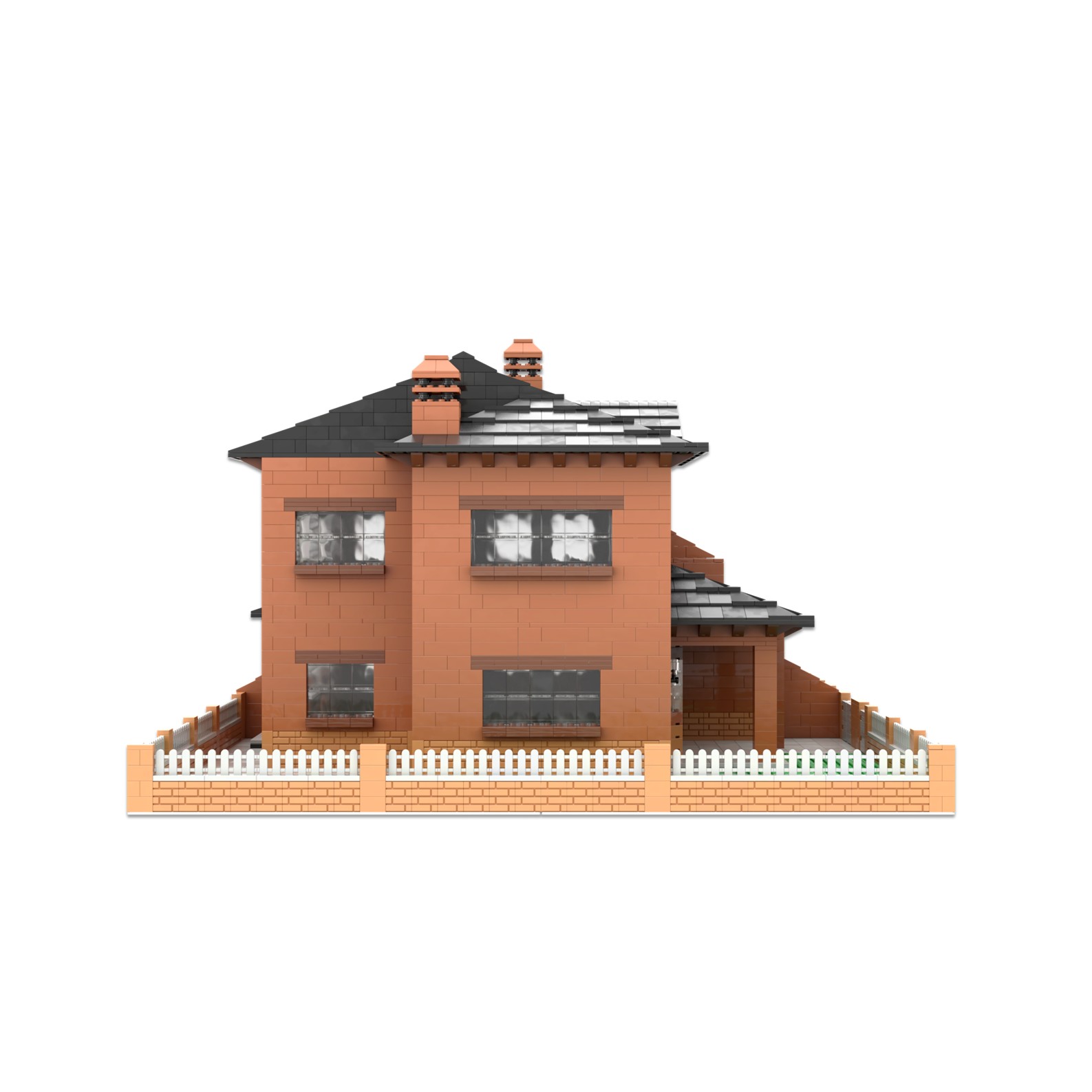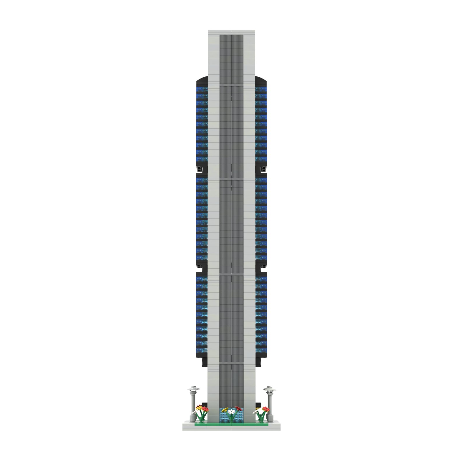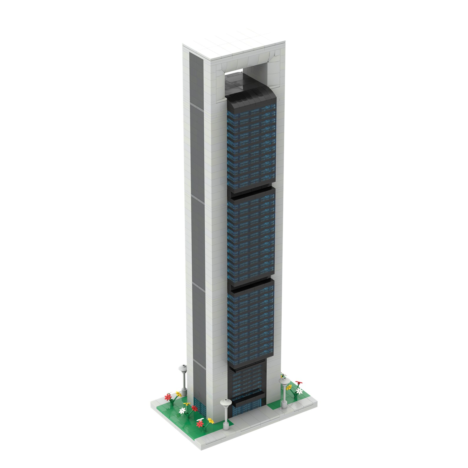 - La estructura de maqueta está diseñada con piezas de color gris y negras, con grandes ventanales de color azul claro.
