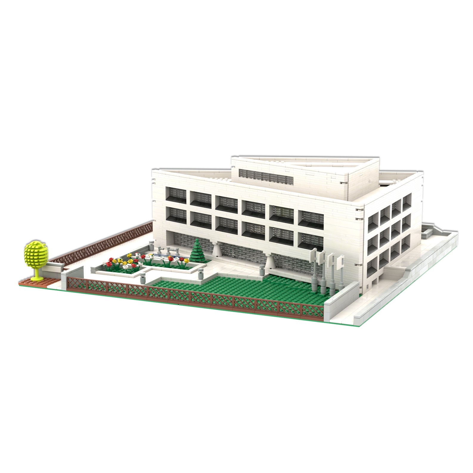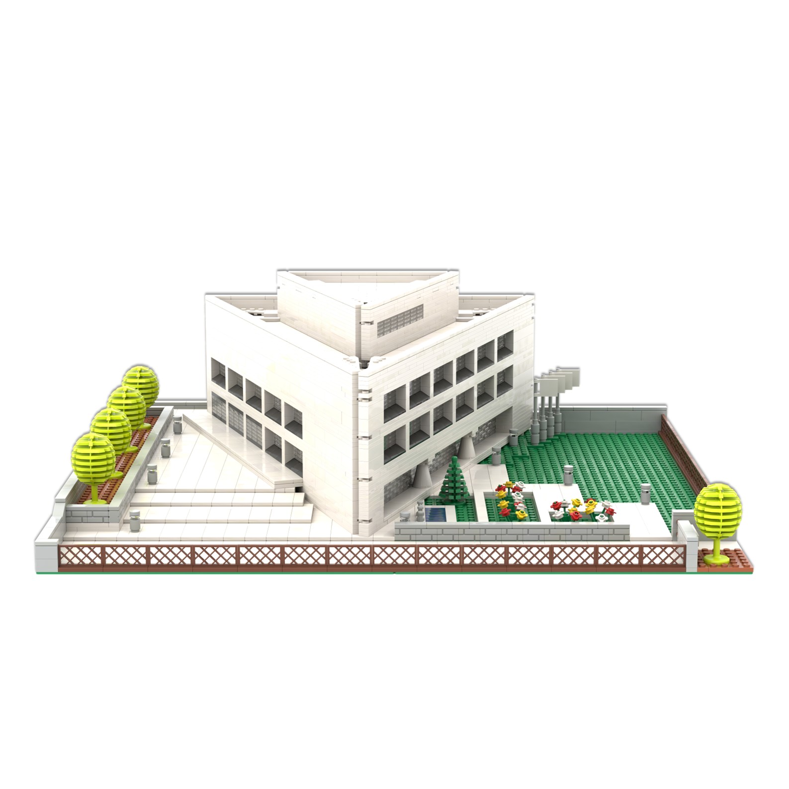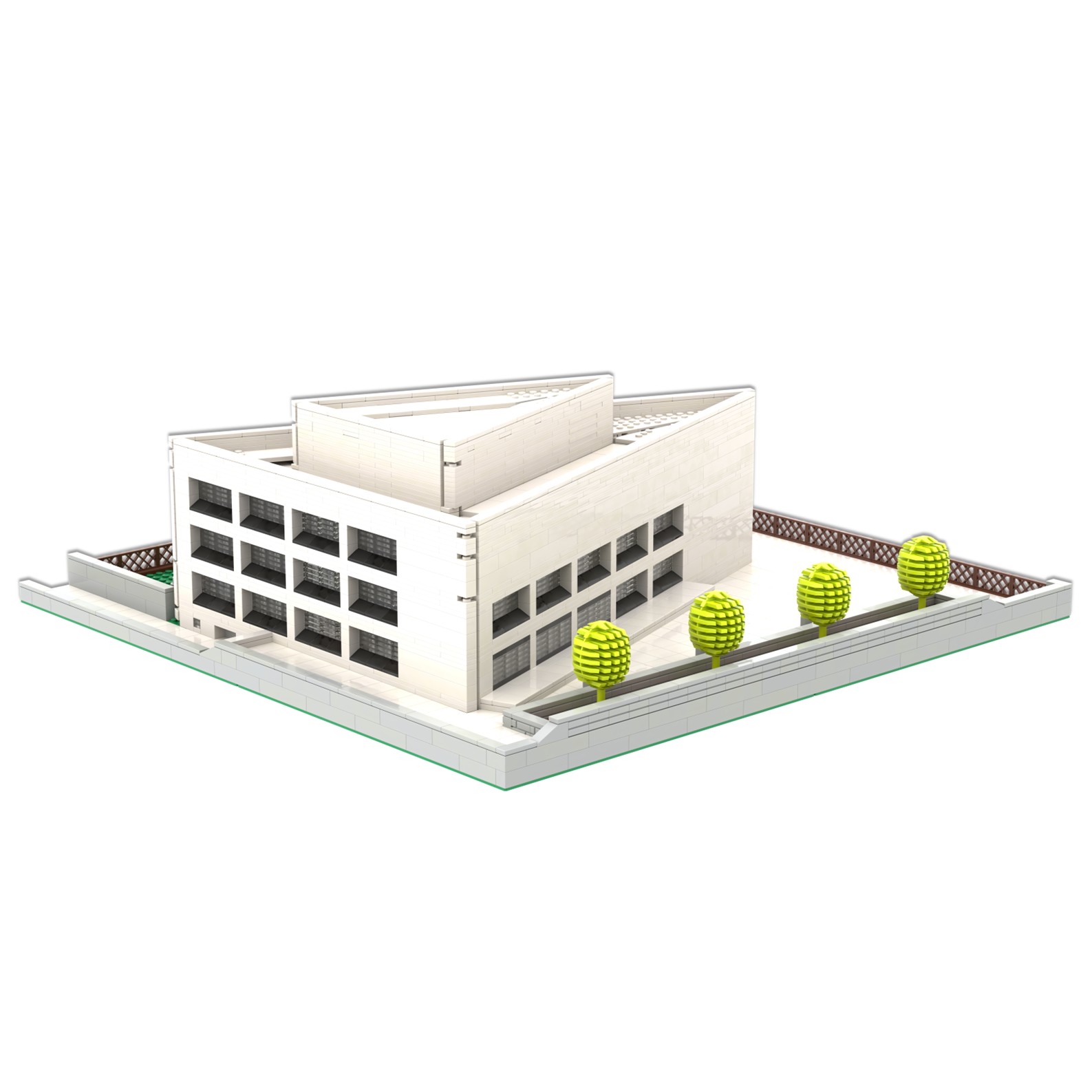 El diseño de esta maqueta ha sido complejo debido a la forma arquitectónica del edificio, se ha representado a escala reducida y con precisión utilizando piezas tipo lego.