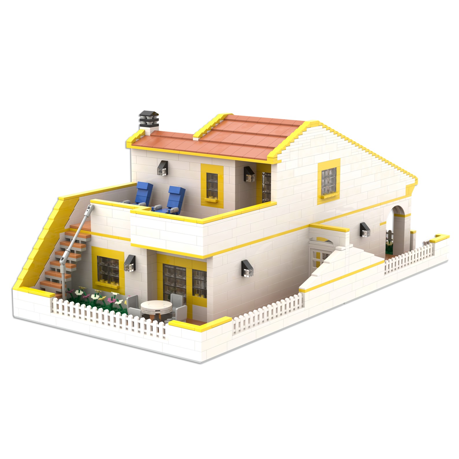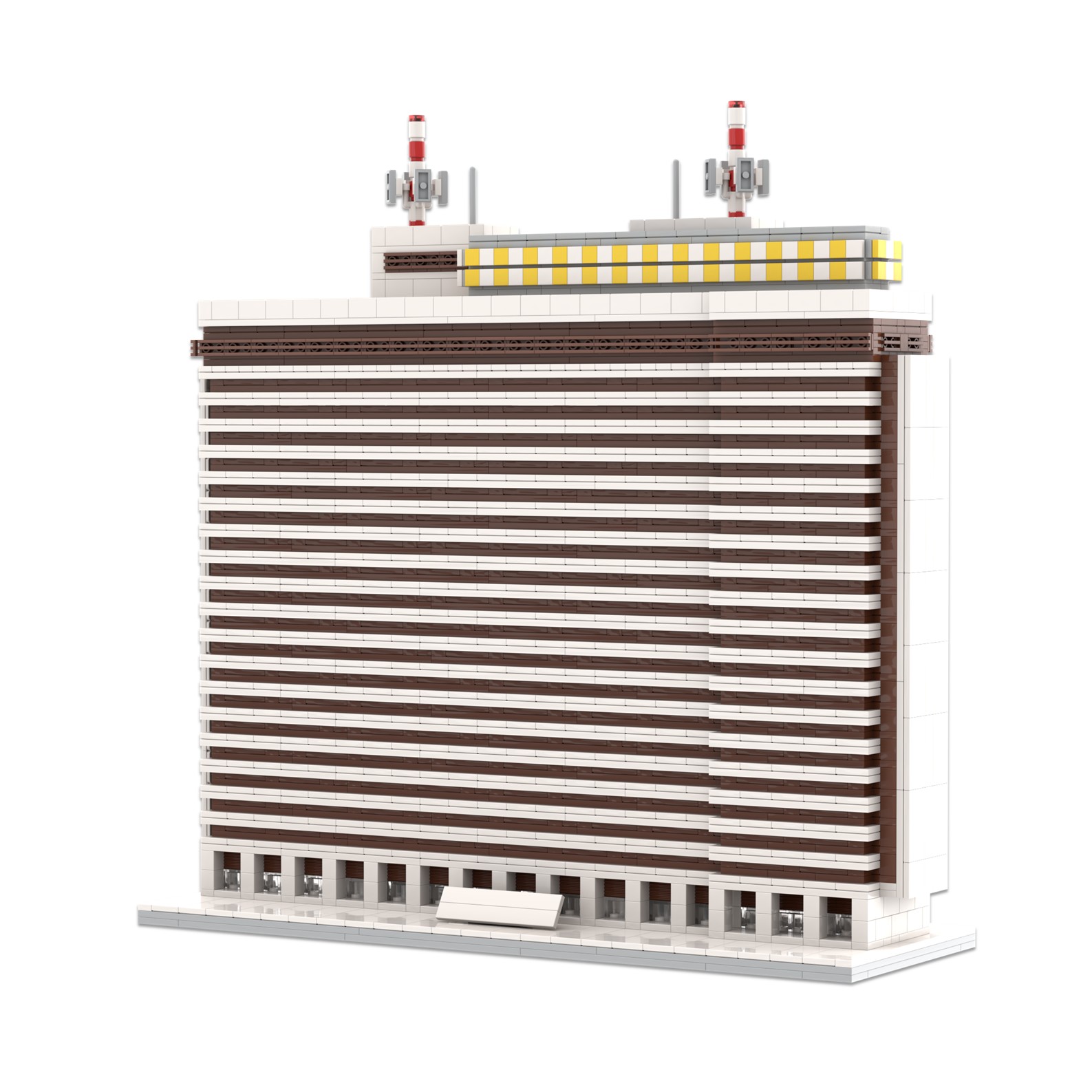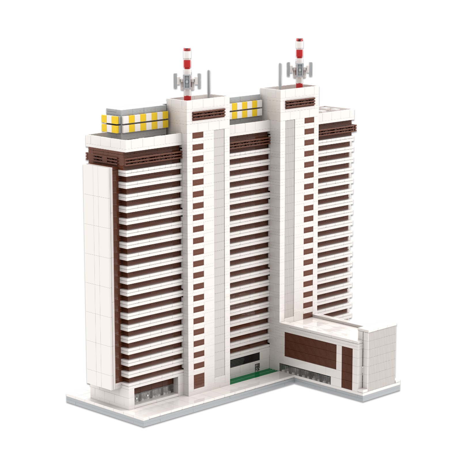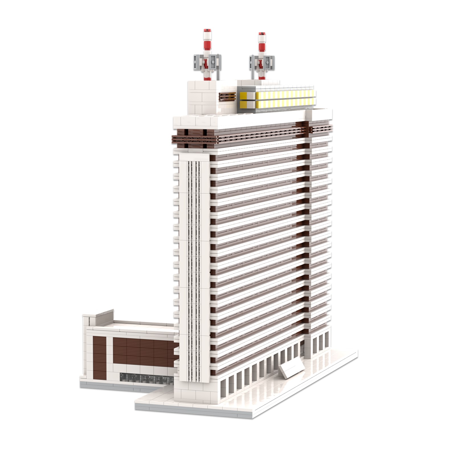 El diseño de esta maqueta ha sido complejo debido a la forma arquitectónica del edificio, se ha representado a escala reducida y con precisión utilizando piezas tipo lego.