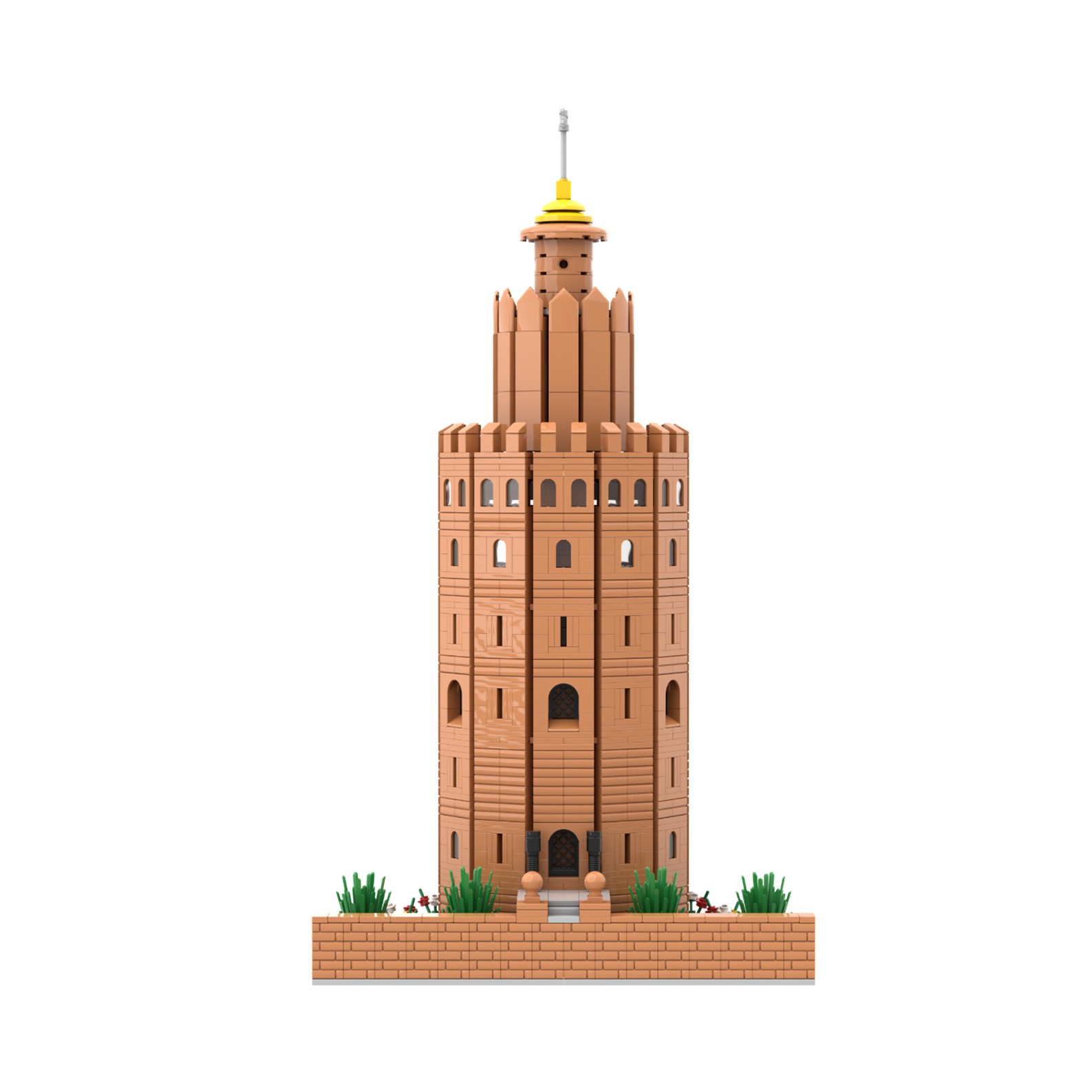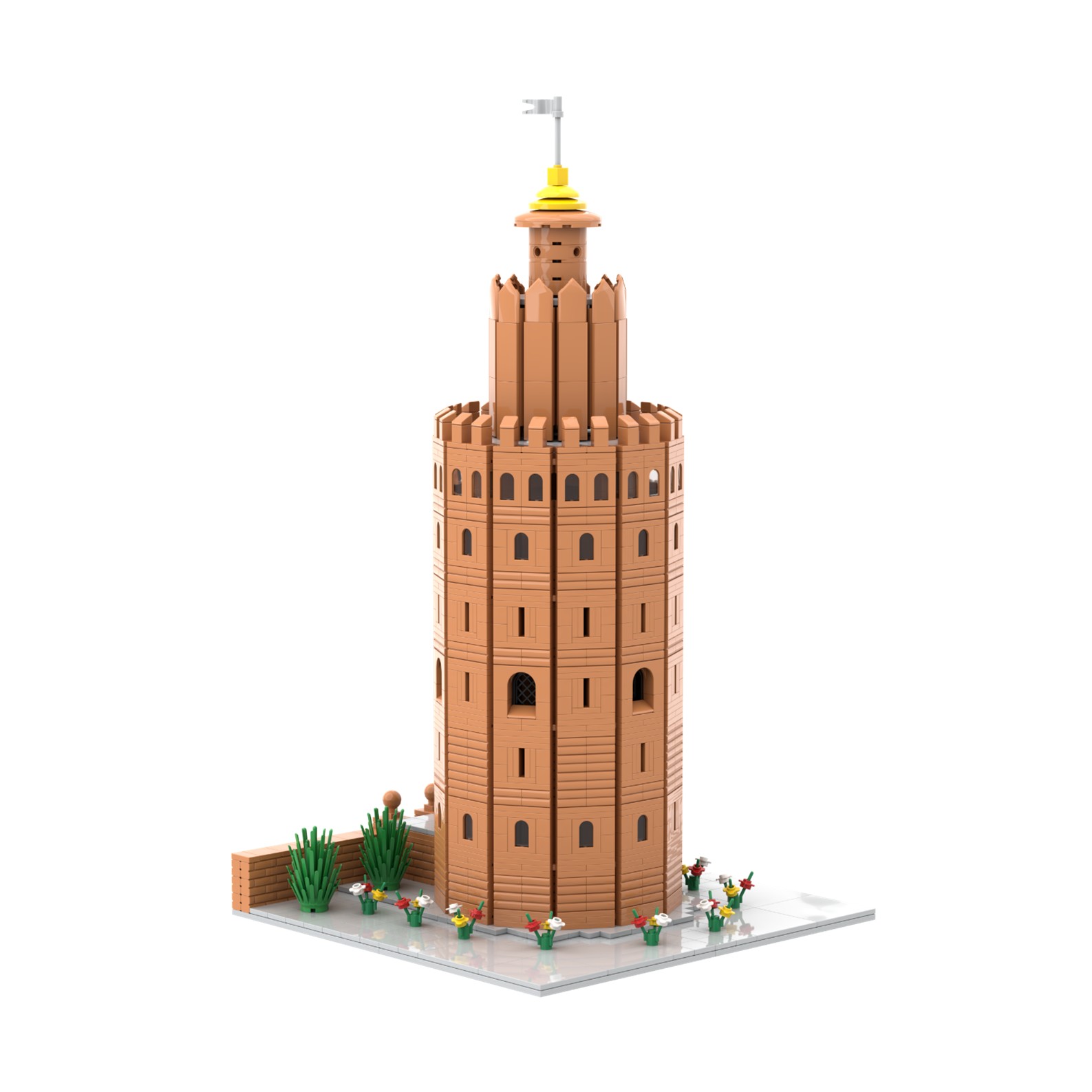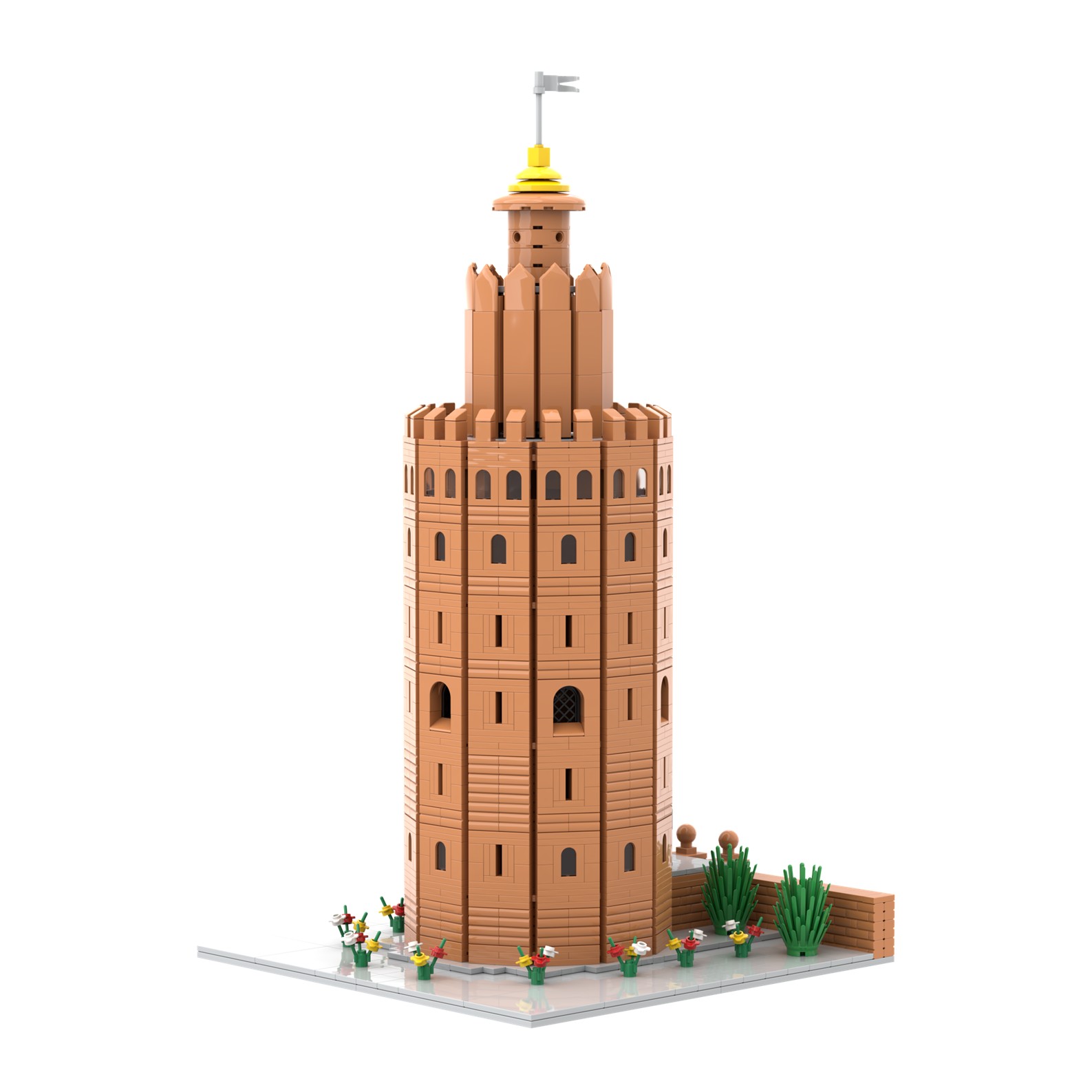 Presentamos una nueva maqueta exclusiva, la Torre del Oro de Sevilla "Bury al-Dahab" realizada con piezas de color marrón, sobre una base cuadrada con azulejos de color gris y adornada con flores de colores en todo su perímetro.