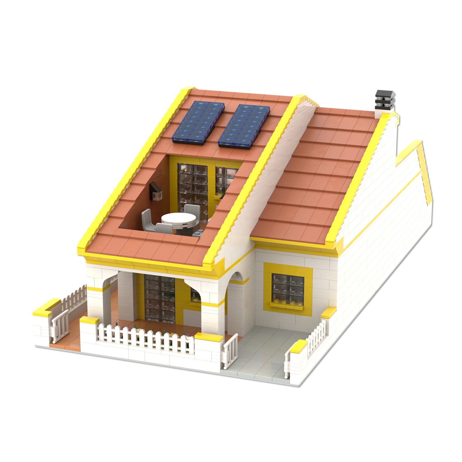 El tejado principal es a dos aguas con una chimenea en la cumbrera que une los dos edificios residenciales.