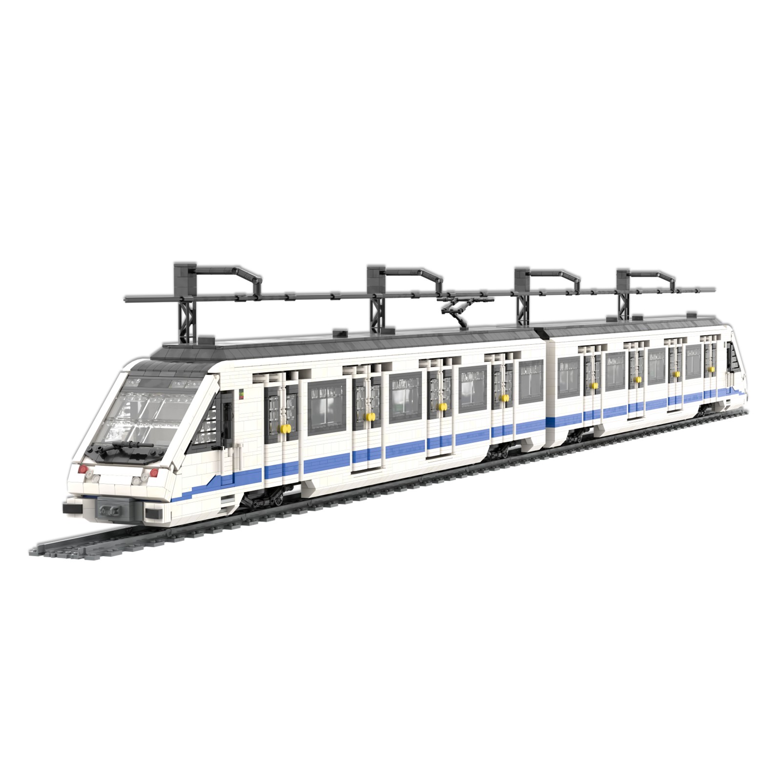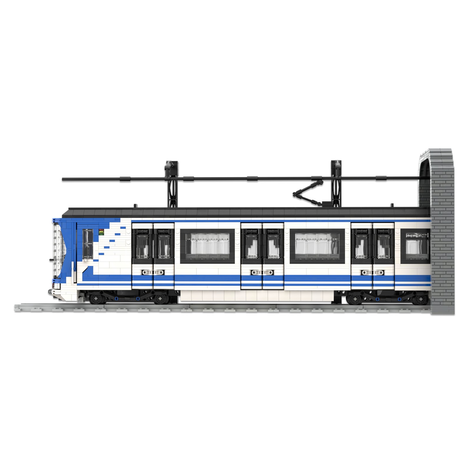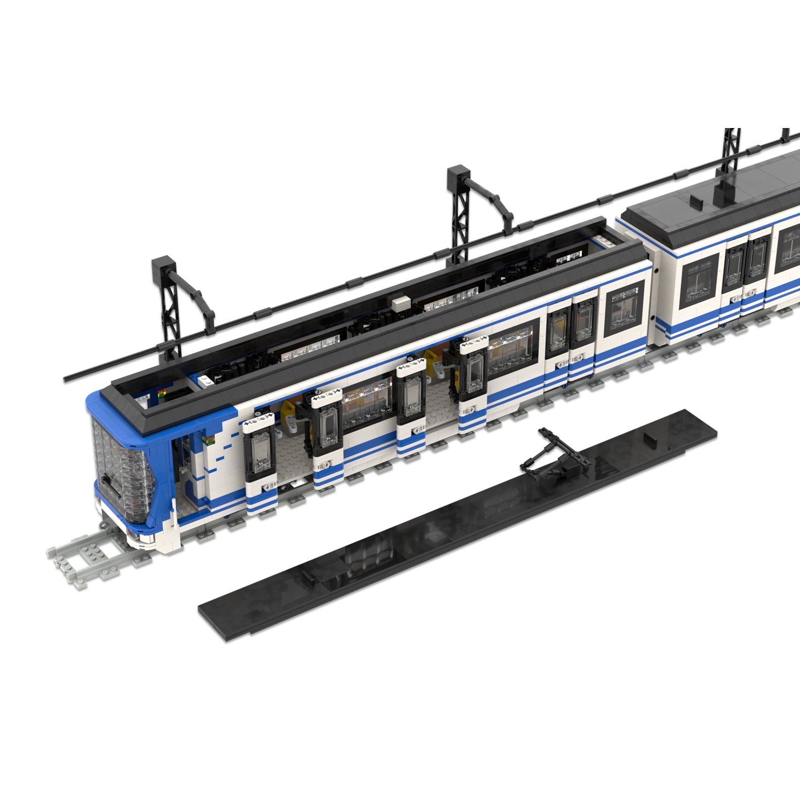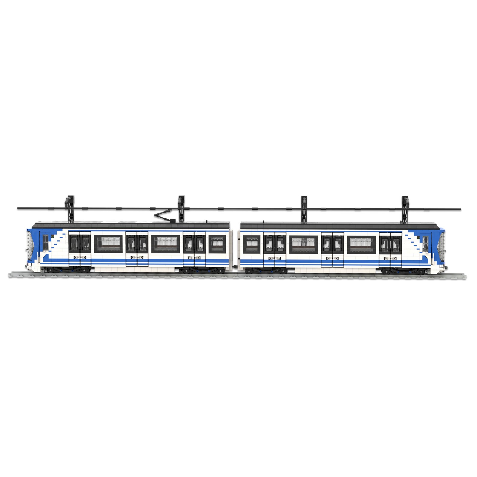 Esta maqueta es una réplica del tren CAF serie 8000, realizada en el color corporativo de Metro de Madrid utilizando piezas blancas, azules y negras.