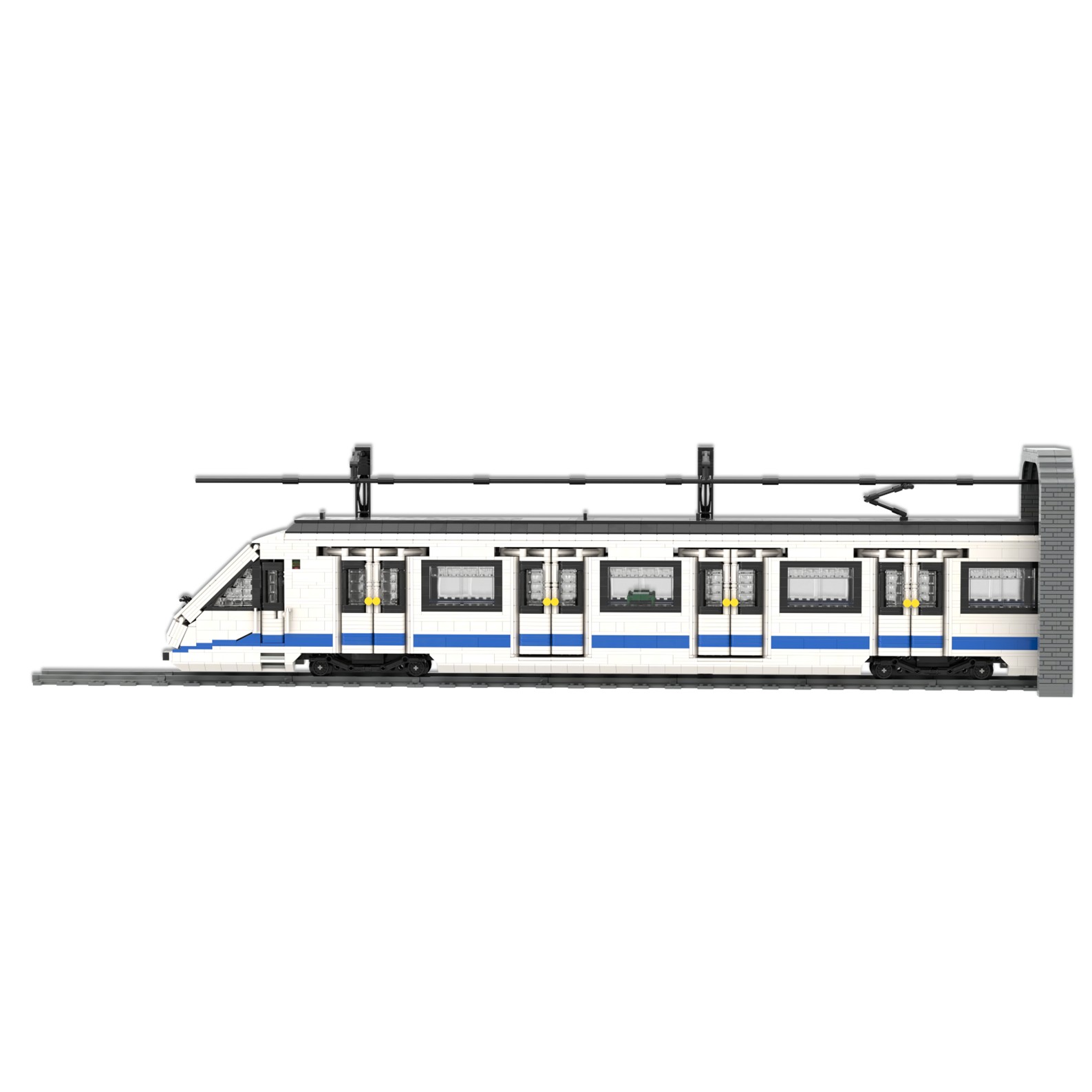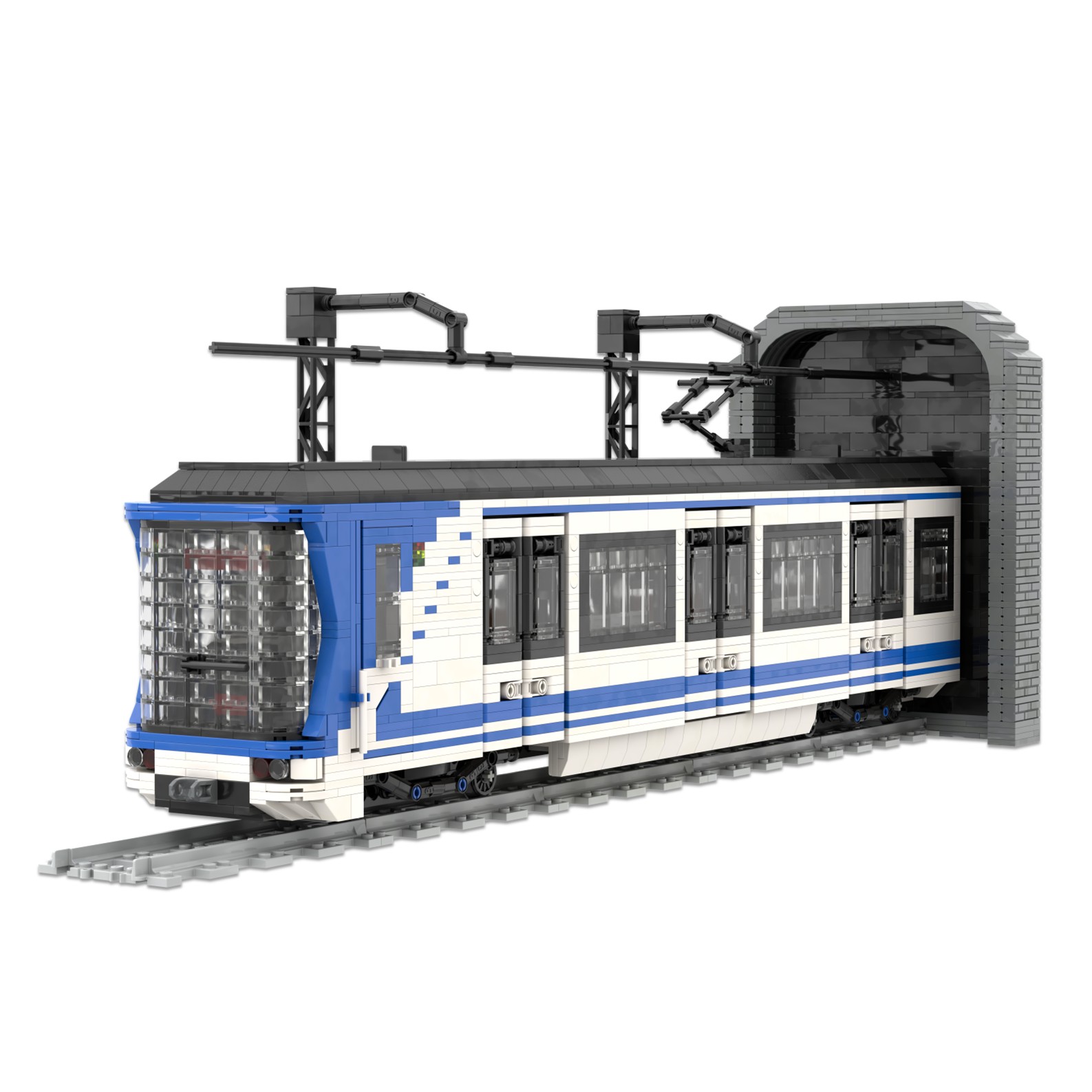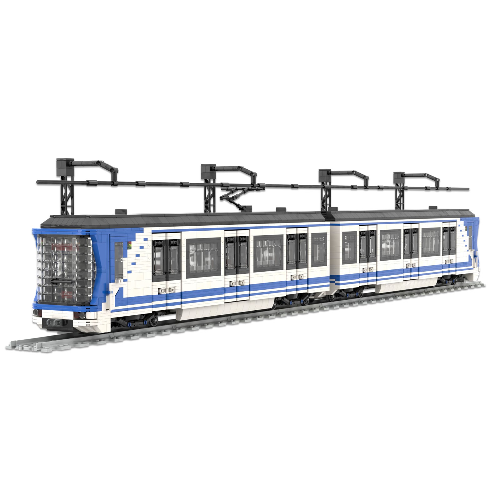 Esta maqueta es una réplica del tren CAF serie 8000, realizada en el color corporativo de Metro de Madrid utilizando piezas blancas, azules y negras.