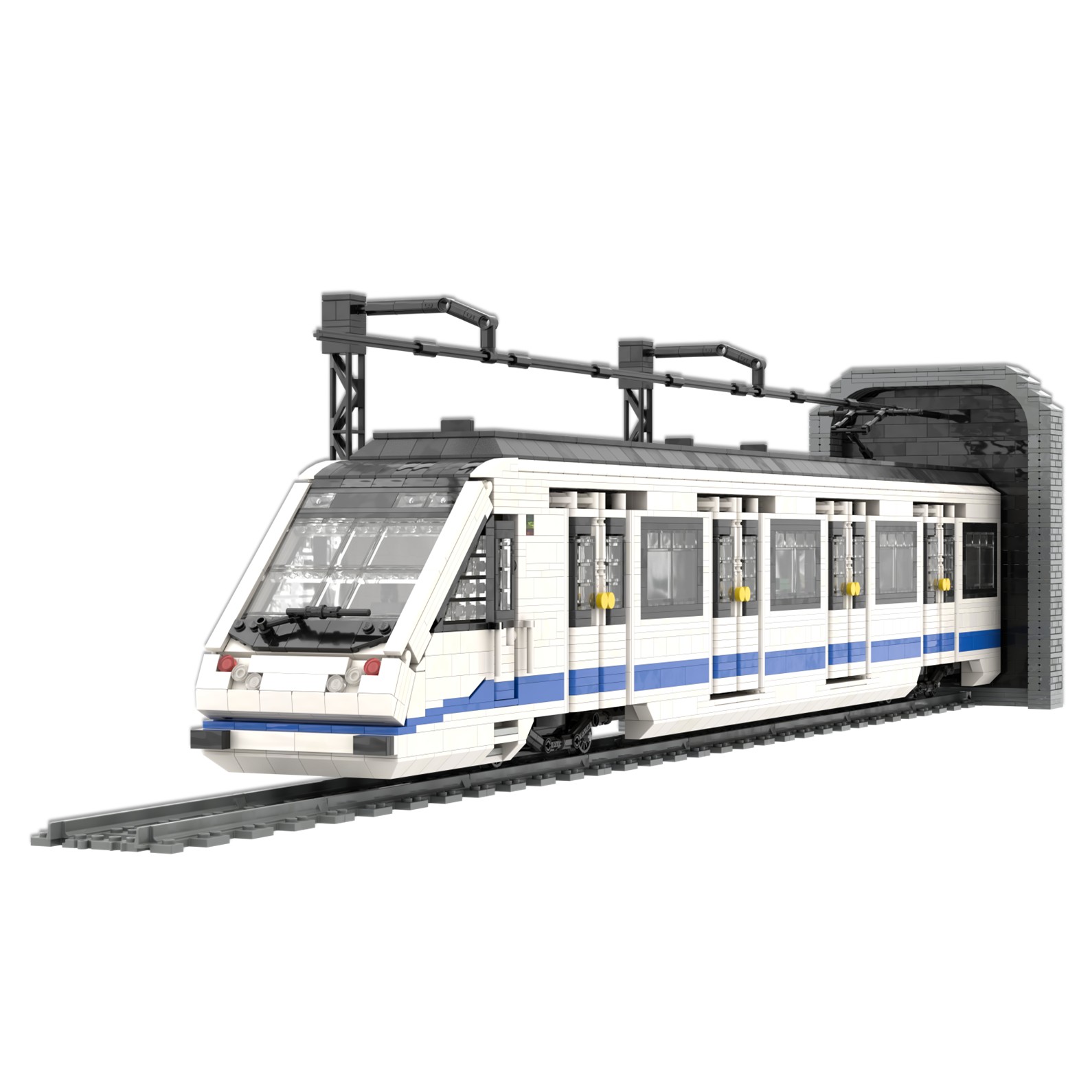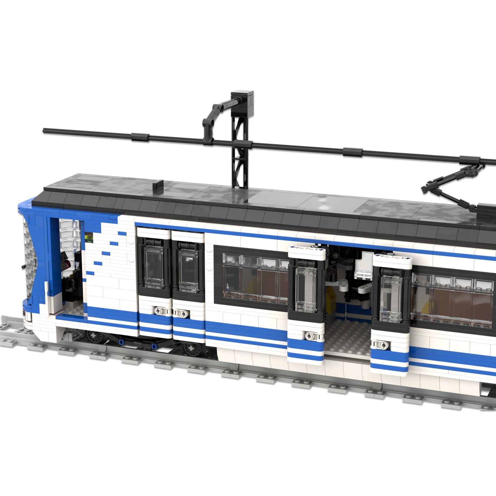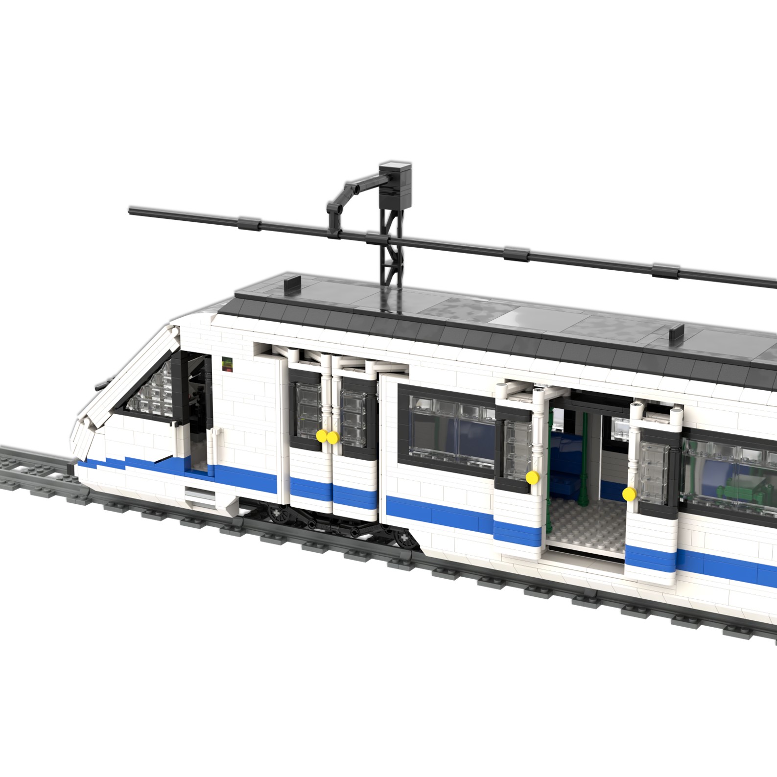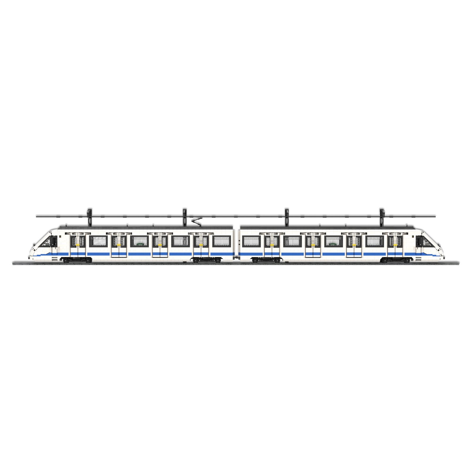 Esta maqueta es una réplica del tren CAF serie 8000, realizada en el color corporativo de Metro de Madrid utilizando piezas blancas, azules y negras.